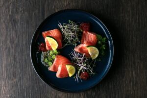 新メニューのご紹介“サーモンのカルパッチョ〜大葉とアーモンドソース〜” ¥1,080〈名古屋サーモン/サーモンビストロ〉